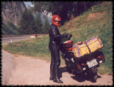 Wenn einer eine Reise tut... 3 Wochen, 2 Personen, da kommt ganz schön was an Gepäck zusammen. Die Reisetasche hinten liegt auf einem Sperrholzbrett, das mit dem Gepäckträger verschraubt ist. Sie wird von mehreren Gummibändern absolut fest fixiert. Der Gepäckträger ist mit einer Strebe verstärkt. Die Halterung am Rahmen ist original zu schwach, also ist der Träger zusätzlich mit Schellen und Streben am Rahmen befestigt. Die Kofferhalter stützen sich an Fußrasten, einer Strebe hinter dem Nummernschild und der Originalblinkerhalterung ab. Die Hauptlast trägt ein dickes Stahlband, das über dem Rahmen verläuft. Durch die Fixierung an mehreren Punkten hält sich das Schwingen in Grenzen. Die Koffer sind mit Spannbändern an den Haltern zusätzlich gesichert und am Aufgehen gehindert. Der Tankrucksack ist ziemlich klein, er erlaubt volle Sicht auf die Instrumente und vollen Lenkeinschlag.
